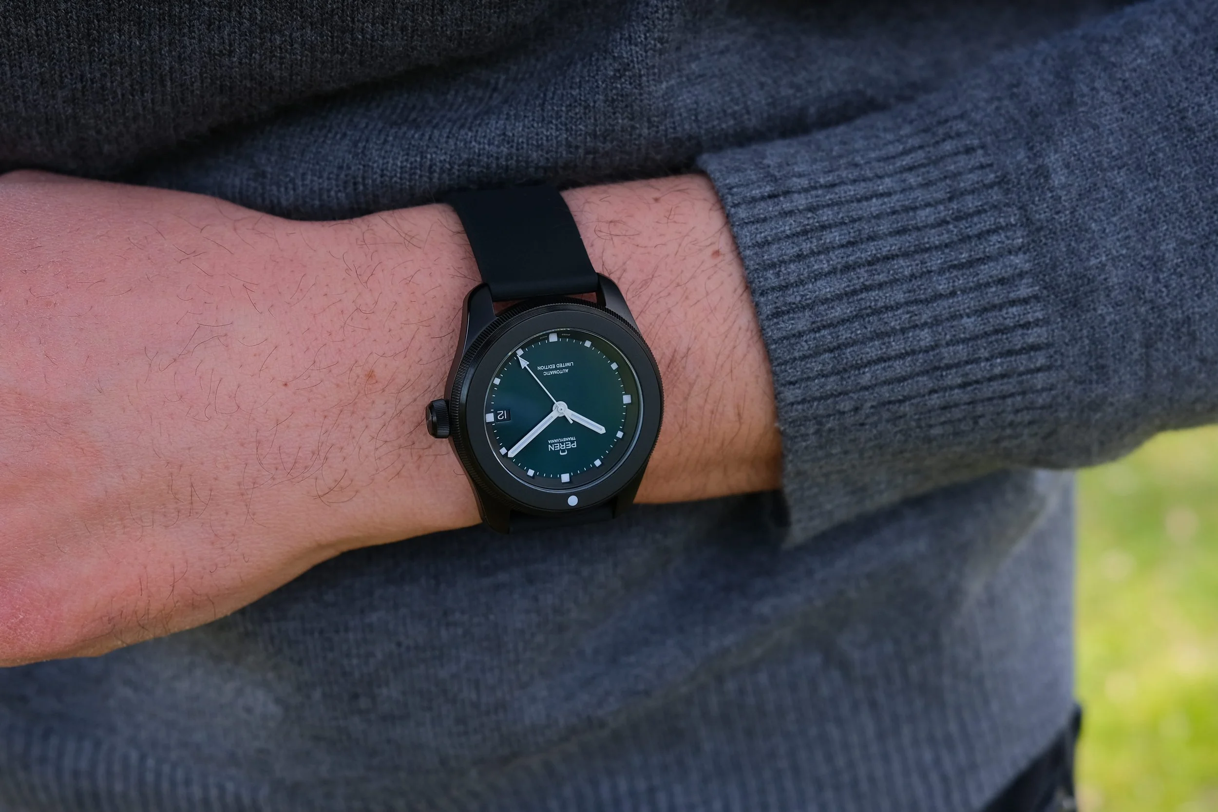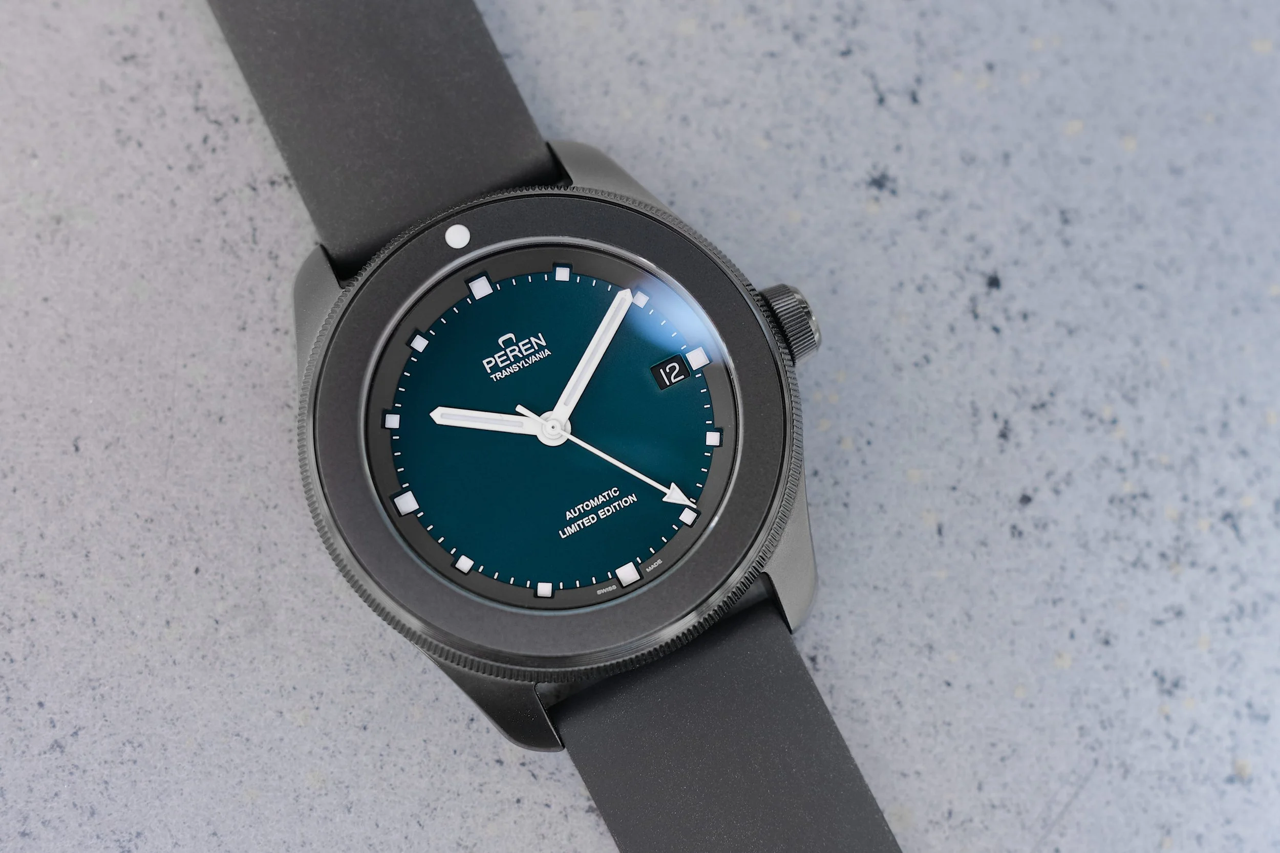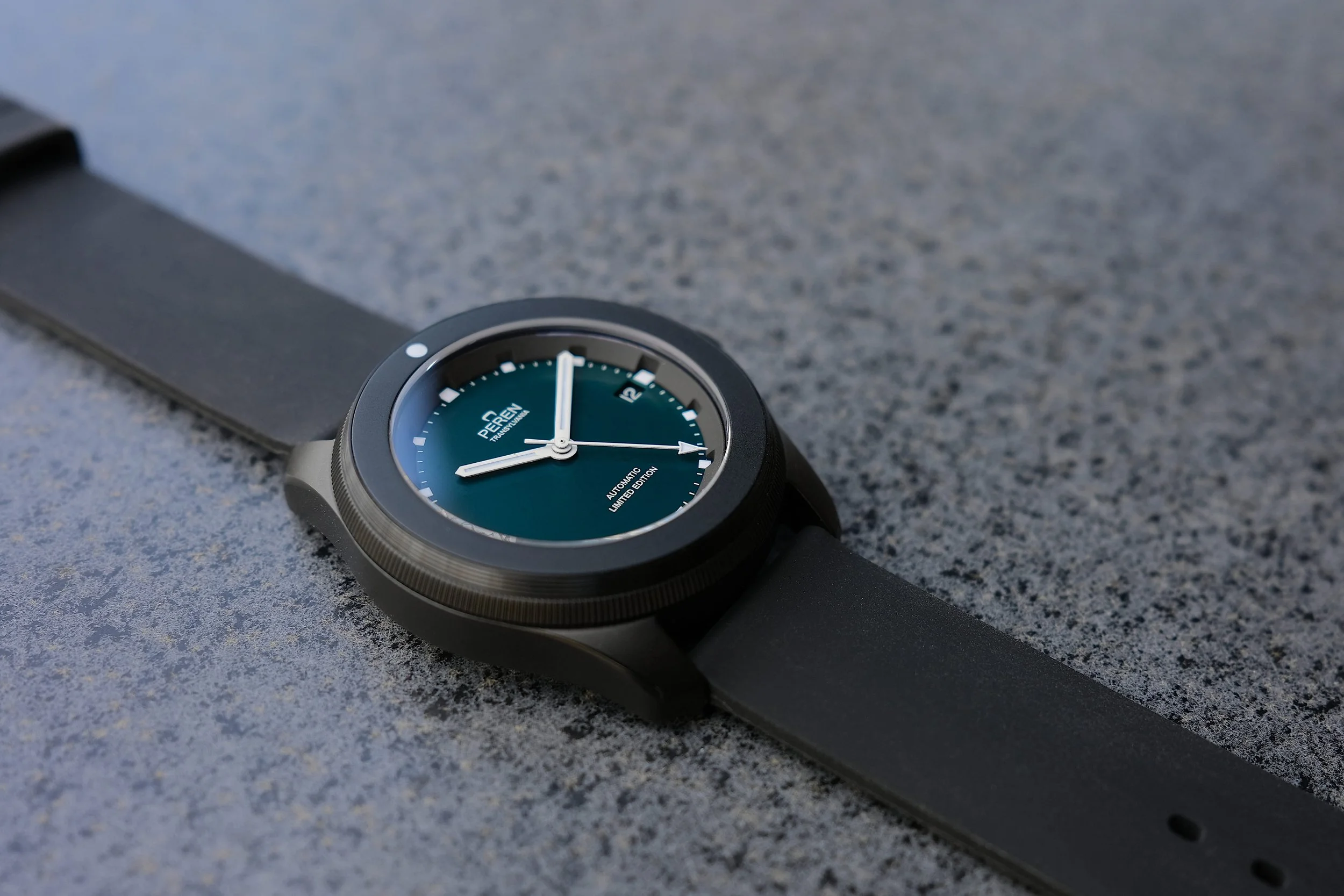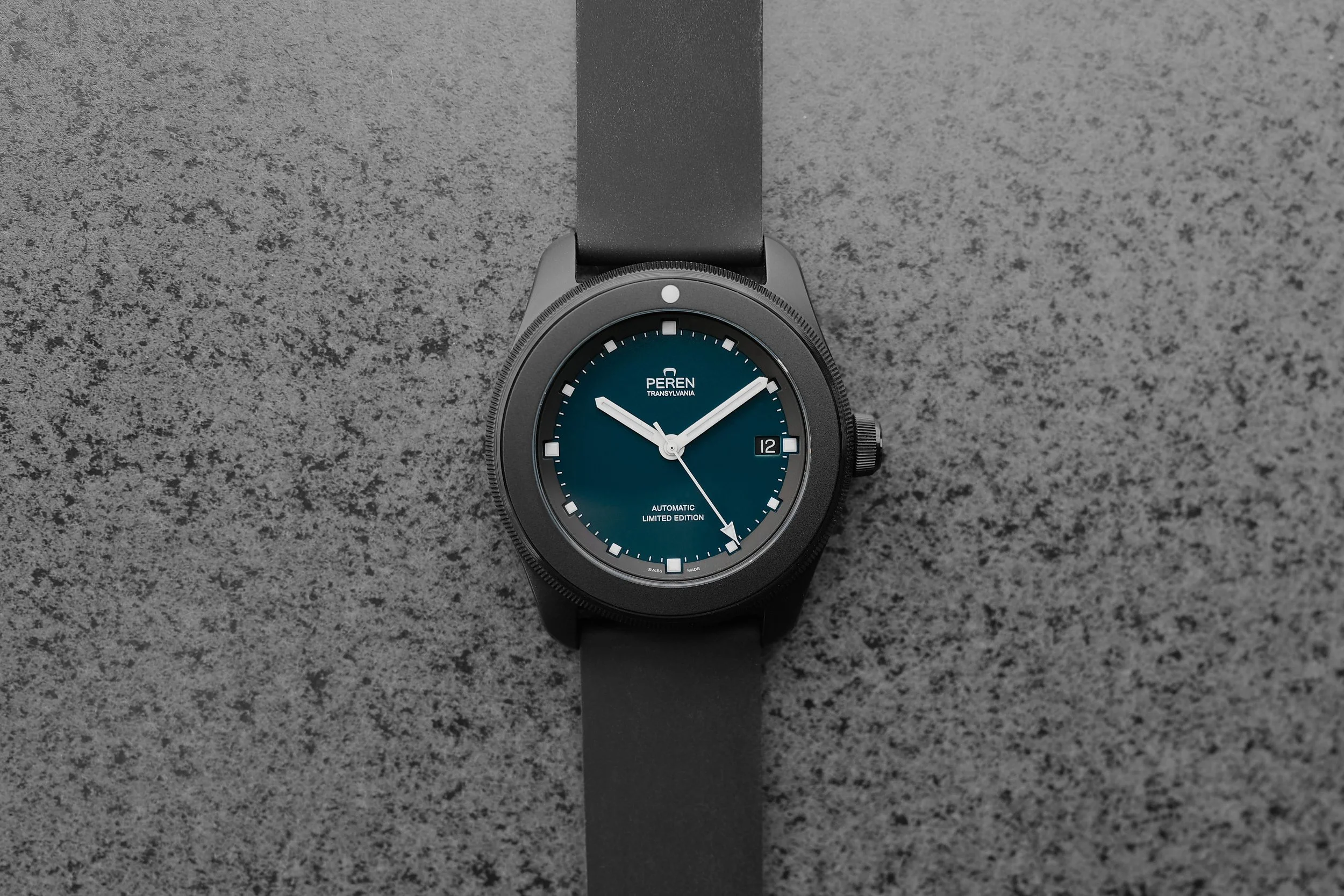 For the 12th anniversary of Peren a Frankenstein watch was put together to bring a lasting homage to our Transylvanian roots. The watch features parts from every watch made from the Nera and the Regia collection including the original Nera dial with the special custom made Nera teal color. There will only be 12 units available worldwide.